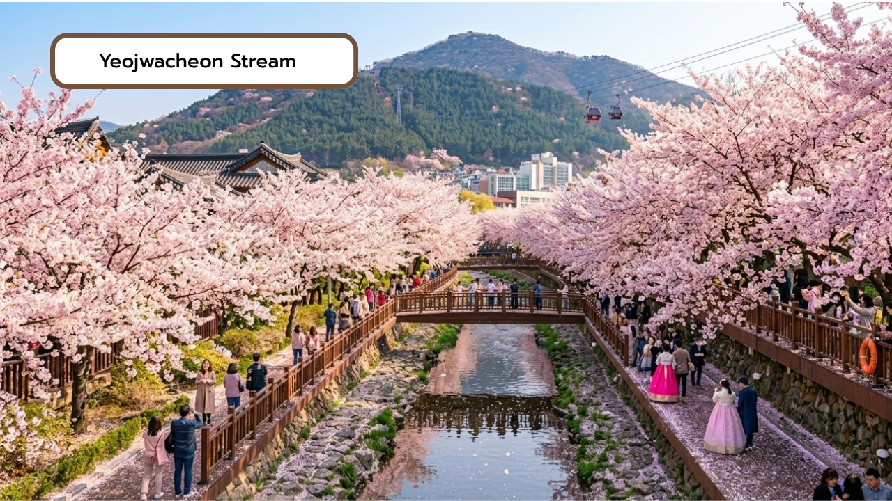 Yeojwacheon Stream - ลำธารชื่อดังในเมืองจินแฮที่ขึ้นชื่อเรื่องอุโมงค์ซากุระสองข้างทาง