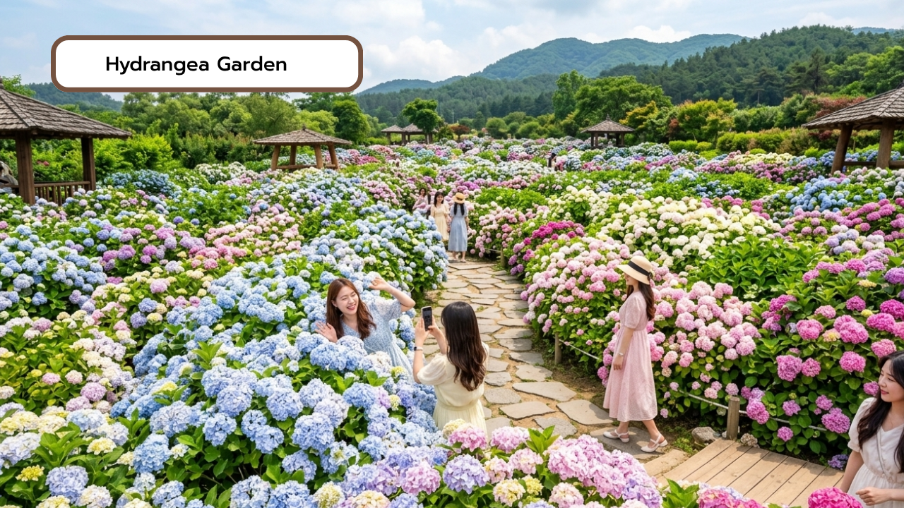 Hydrangea Garden - สวนดอกไฮเดรนเยียสีพาสเทลที่บานสะพรั่งในช่วงต้นฤดูร้อน